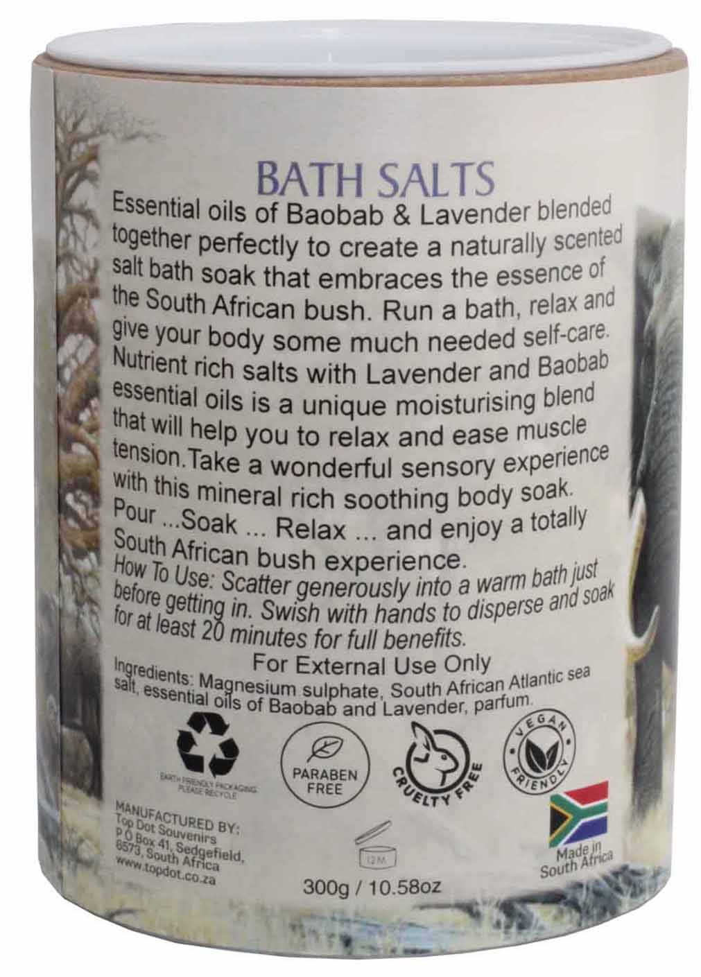 Essential oils of Baobab & Lavender blended together perfectly to create a naturallly scented salt bath soak that embraces the essence of the South African Bush