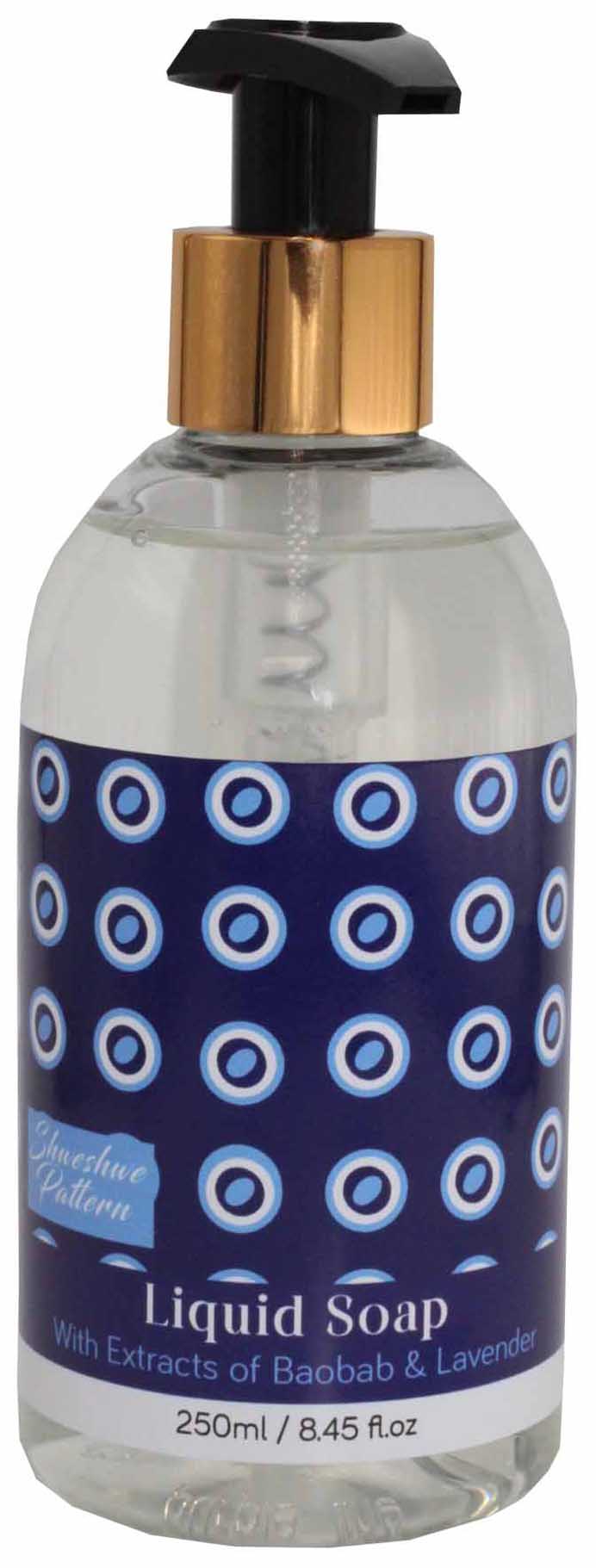 Shweshwe Liquid Soap 250ml with gold collar and black pump.